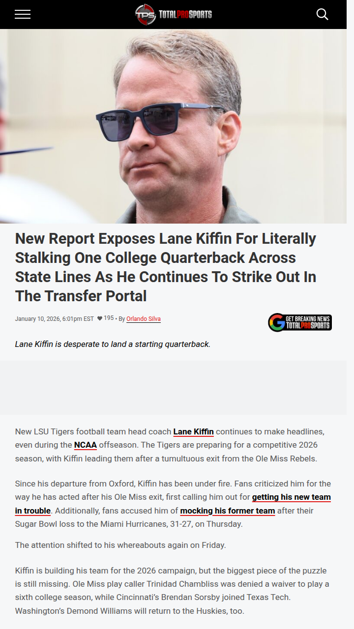 Chad Williams+FollowKiffin’s QB Chase: Desperate or Genius?Coach Lane Kiffin is making waves again, this time for reportedly trailing Arizona State’s Sam Leavitt across state lines in a high-stakes transfer portal battle. With top QB targets slipping away, Kiffin’s all-in pursuit of Leavitt has fans split: is this next-level recruiting or just plain desperate? The rivalry for Leavitt is heating up with Tennessee and Miami in the mix. What’s your take—will Kiffin’s persistence pay off or backfire? #Sports #Football #LaneKiffin00Share
