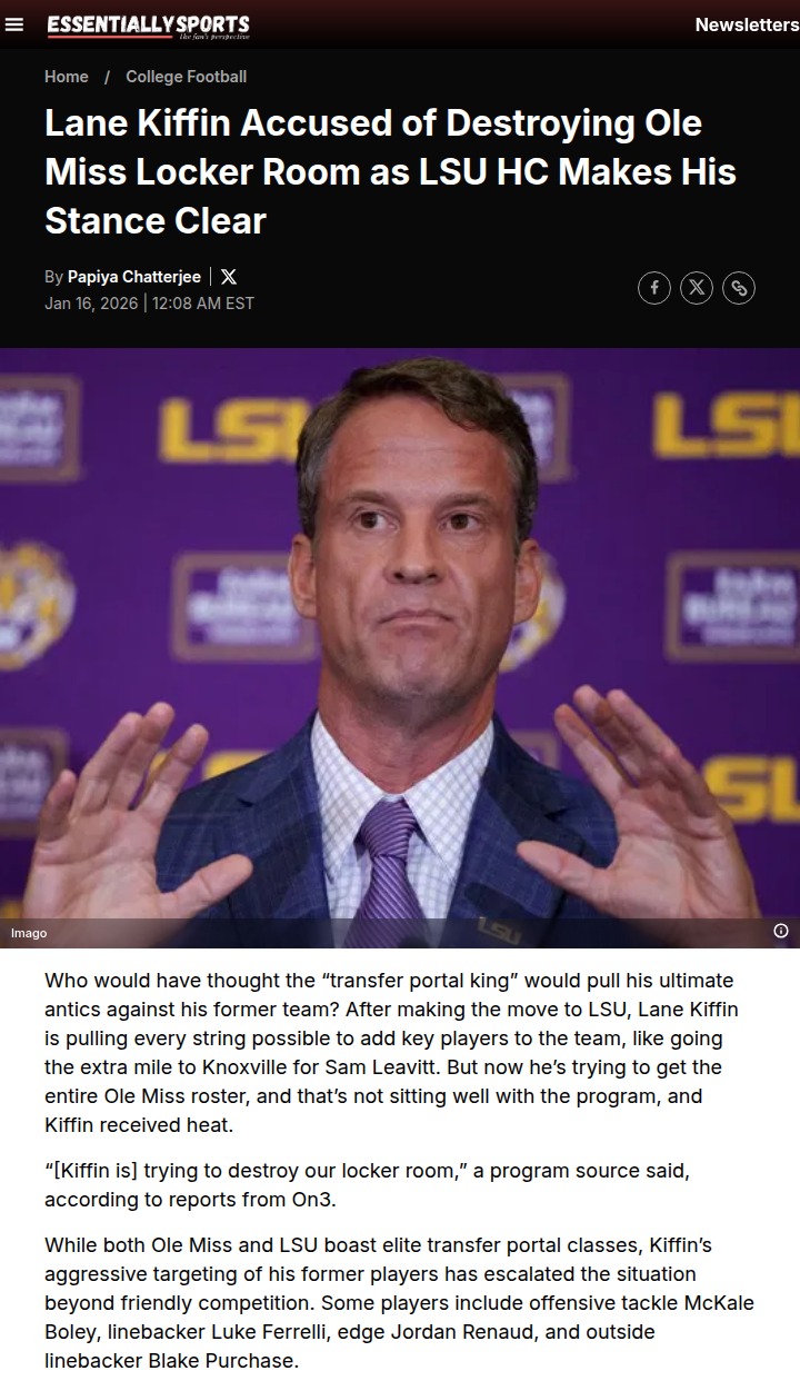 John Camacho+FollowKiffin’s Portal Raid: Rebels vs Tigers Heating UpThe drama between the “transfer portal king” Lane Kiffin and his old squad, the Rebels, is reaching new heights. Now at LSU, Kiffin is aggressively recruiting Ole Miss players, and some in Oxford say he’s trying to “destroy our locker room.” With both teams leading SEC transfer rankings, this rivalry is turning personal. Is Kiffin just playing the game, or is he crossing the line? Golding’s first year as HC just got a lot tougher. Thoughts on this wild portal battle? #Sports #Football #LaneKiffin01Share