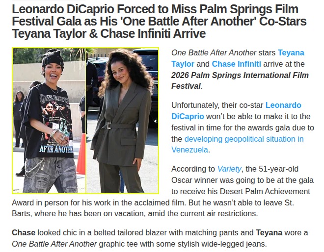 vanessadaniels+FollowLeonardo DiCaprio misses Palm Springs festLeonardo DiCaprio couldn’t make it to the Palm Springs Film Festival gala, leaving his co-stars Teyana Taylor and Chase Infiniti to represent their film, One Battle After Another, on the red carpet. The reason? Ongoing air restrictions linked to the Venezuela crisis kept Leo grounded in St. Barts, where he’s been vacationing. Meanwhile, Taylor and Infiniti turned heads with their festival looks, and Amanda Seyfried was also spotted in town for her own film. How do you think these real-world events are impacting Hollywood’s awards season this year? #Entertainment #Movies #LeonardoDiCaprio00Share