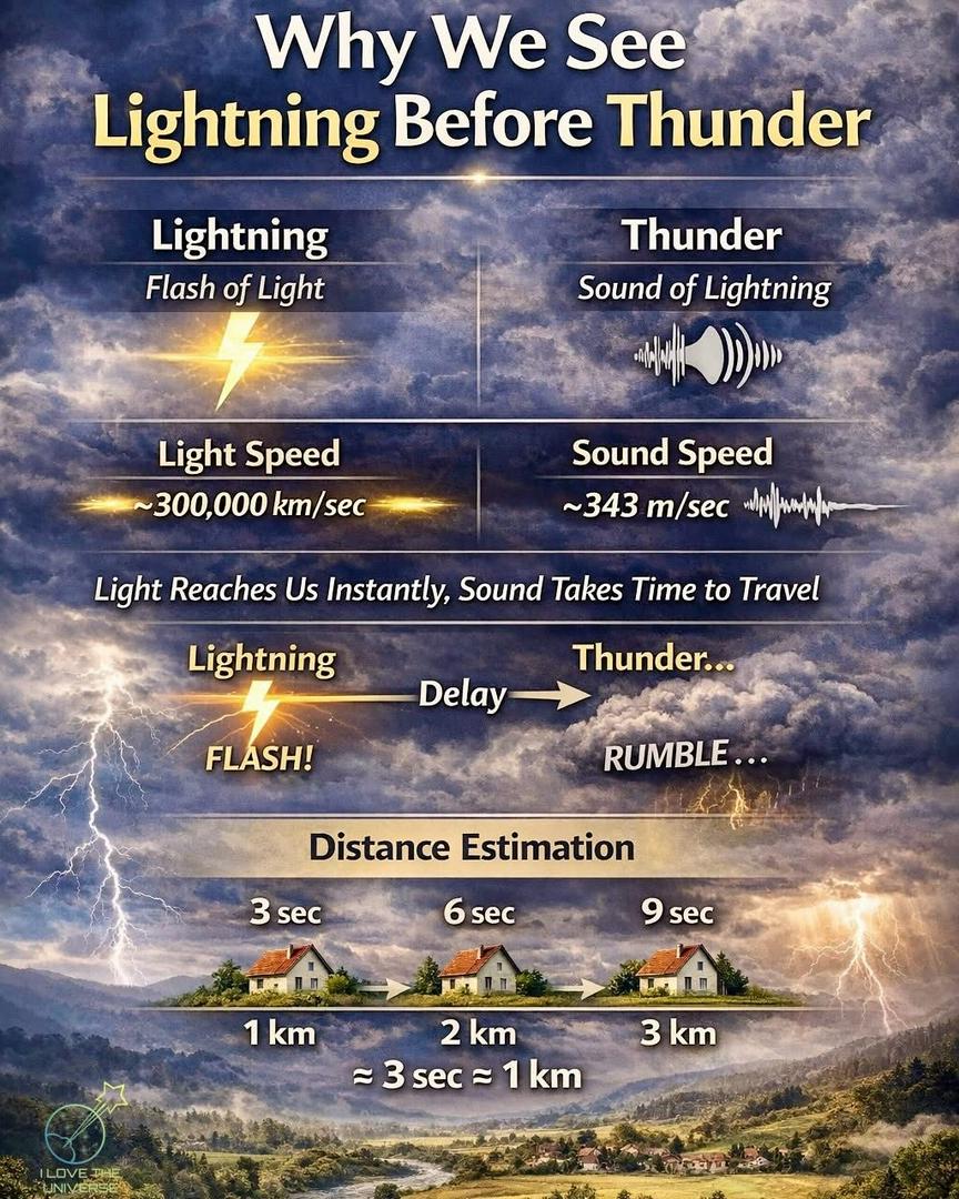 justme +FollowWhen a storm approaches, we always notice the lightning ⚡️ before we hear the thunder 💥 — and that’s no accident. Light travels at incredible speed, reaching our eyes almost instantly, while sound moves much slower through the air. That’s why thunder comes a few moments after the flash. But thunder is more than just a noise — it forms when the air is heated to over 30,000°C (54,000°F) in a split second. This intense heat causes the air to expand rapidly, producing a powerful shockwave we hear as a deep rumble. By counting the seconds between the flash and the sound, we can even estimate how far away the storm is. Nature isn’t just putting on a show — it follows precise physics every single time. #Lightning #Thunder #Science #Weather #Nature #Physics #DidYouKnow00Share