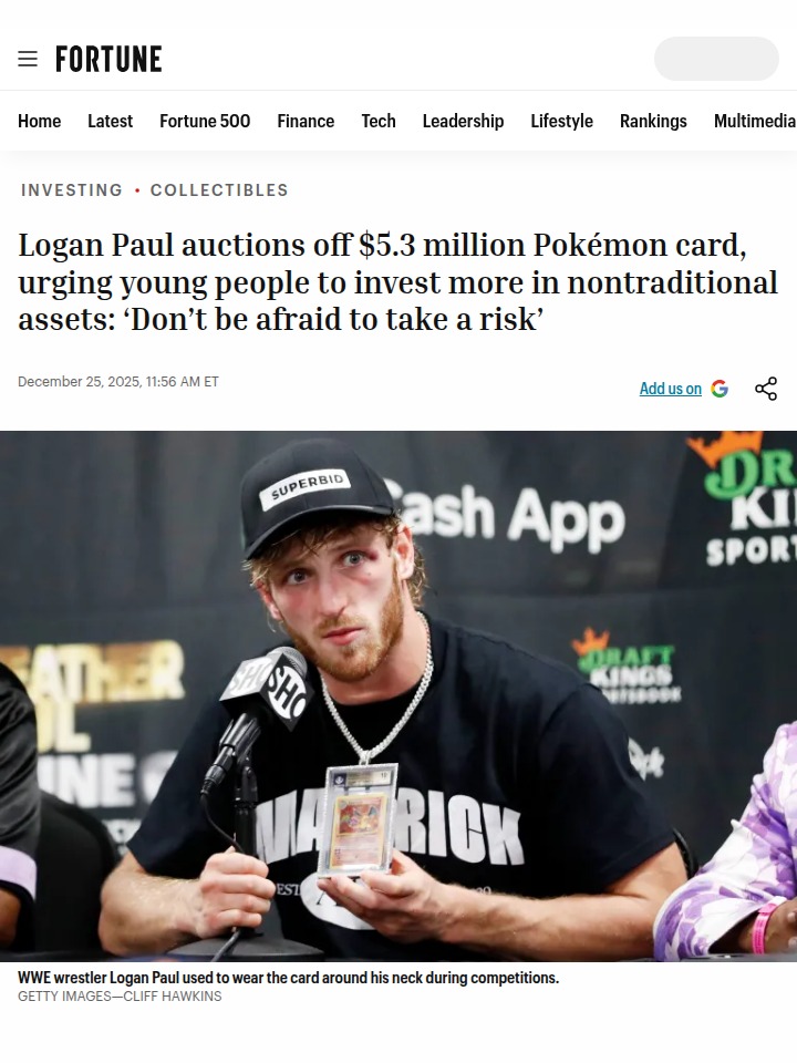 Elizabeth Lewis+FollowLogan Paul’s $5M Pokémon Card Money MoveLogan Paul just dropped a hot tip for young investors: skip the boring stocks and consider collectibles like Pokémon cards. He’s about to auction his $5.3 million Pikachu card, showing how some millennials are betting big on nostalgia instead of Wall Street. But heads up—Paul admits these trends can fizzle fast (remember Beanie Babies?). If you’re thinking about alternative investments, do your homework and don’t put all your eggs in one Poké Ball! #Business #Market #LoganPaul01Share
