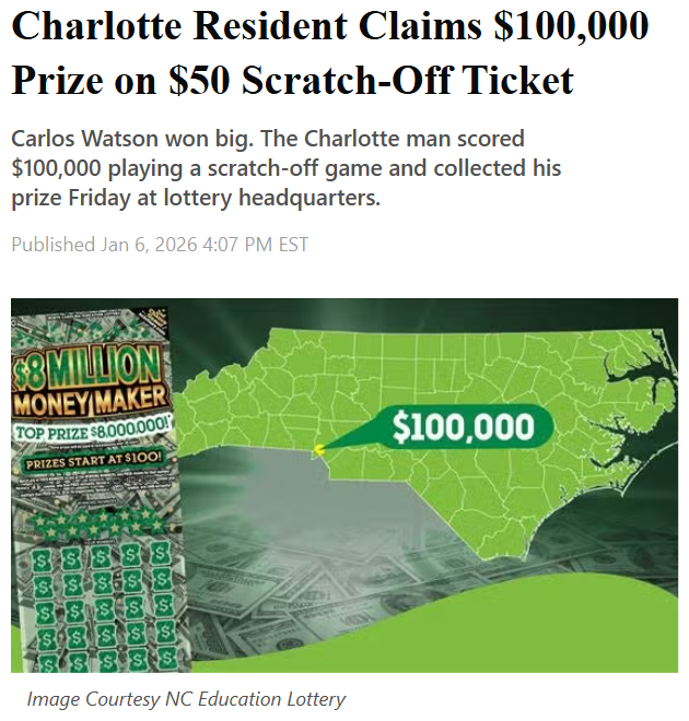 Karen Huynh+FollowCharlotte man’s $100K lottery win changes everythingImagine picking up a $50 scratch-off at your local gas station and walking away with $100,000. That’s exactly what happened to Carlos Watson in University City, Charlotte. After taxes, he took home $72,024—just in time to tackle bills and home repairs. Even more wild: there are still three $8 million and four $100,000 prizes left in the $8 Million Money Maker game. Plus, lottery money helped fund $60 million for Mecklenburg County schools last year. Would you try your luck for a shot at a life-changing win? #News #Charlotte #LotteryWin00Share