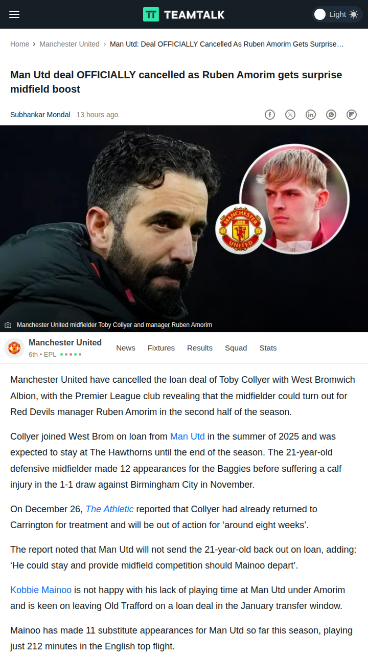 Timothy Thompson+FollowRed Devils’ Midfield Shake-Up: Collyer ReturnsBig news for the Red Devils faithful! With Toby Collyer’s loan to West Brom officially cancelled, the young midfield anchor is back at Carrington and could soon be in Ruben Amorim’s plans—especially if Mainoo pushes for a January exit. Collyer’s return adds depth just when the midfield was looking thin. Could this be the boost United needs for the second half? Let’s hear your thoughts on this midfield shuffle! #Sports #Soccer #MUFC00Share