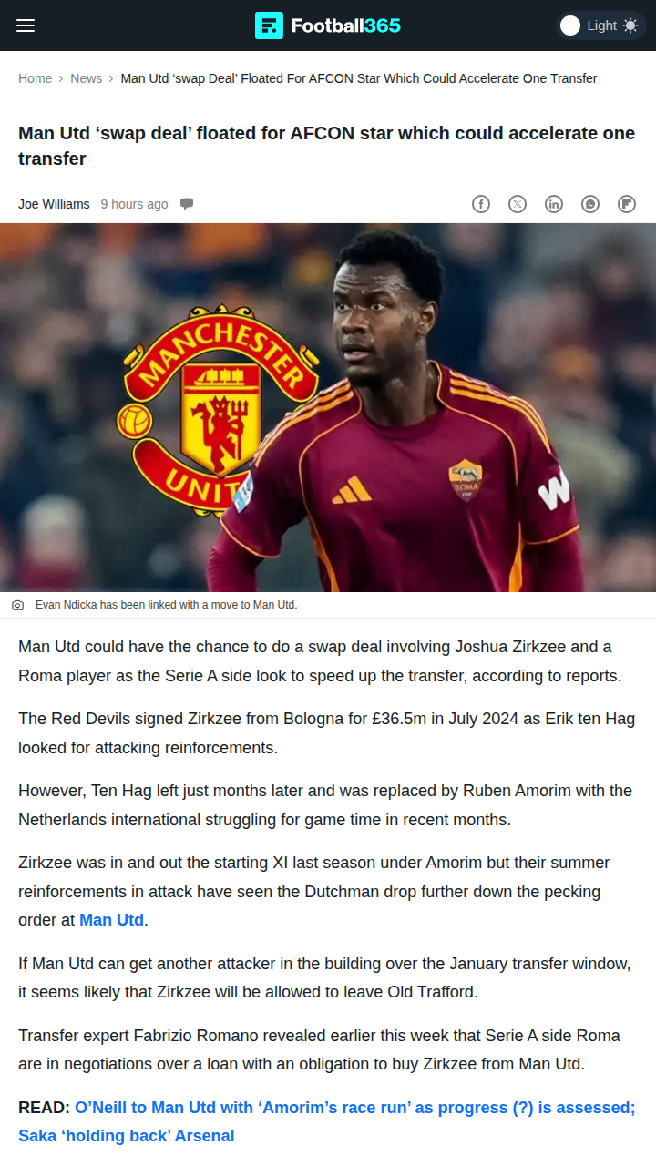 Malik Williams+FollowRed Devils Eye Ndicka in Zirkzee Swap?Looks like the Red Devils could be making some big moves! With Joshua Zirkzee struggling for minutes under Amorim, rumors are swirling about a potential swap deal with Roma for AFCON standout Evan Ndicka. If United can land another attacker this window, Zirkzee could be heading to Serie A, while Ndicka might bolster our backline. Thoughts on this possible switch, and would Ndicka be the defensive upgrade we need? #Sports #Soccer #MUFC00Share
