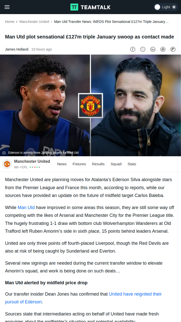 Tara Moran+FollowRed Devils Eye Ederson in Transfer Tug-of-WarLooks like the Red Devils are making serious moves this January! United are back in for Atalanta’s Ederson, hoping to snap him up at a bargain if his price drops. With the midfield still lacking bite compared to Arsenal and City, this could be a game-changer. But Atalanta want to keep their star, and Ederson himself wants Champions League football. Will INEOS pull off this swoop or will we see another drawn-out transfer saga? #Sports #Soccer #MUFC00Share