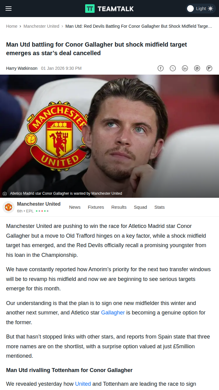 Malik Williams+FollowRed Devils & Spurs in Gallagher Tug-of-WarLooks like the Red Devils are going head-to-head with Spurs for Conor Gallagher, who’s eager for more minutes ahead of the World Cup. The real twist? United have a shock £5m wonderkid on their radar too. But Gallagher’s massive wages could be the dealbreaker—unless Atletico agree to chip in. Could this be the midfield shakeup we’ve been waiting for at Old Trafford? #Sports #Soccer #MUFC00Share