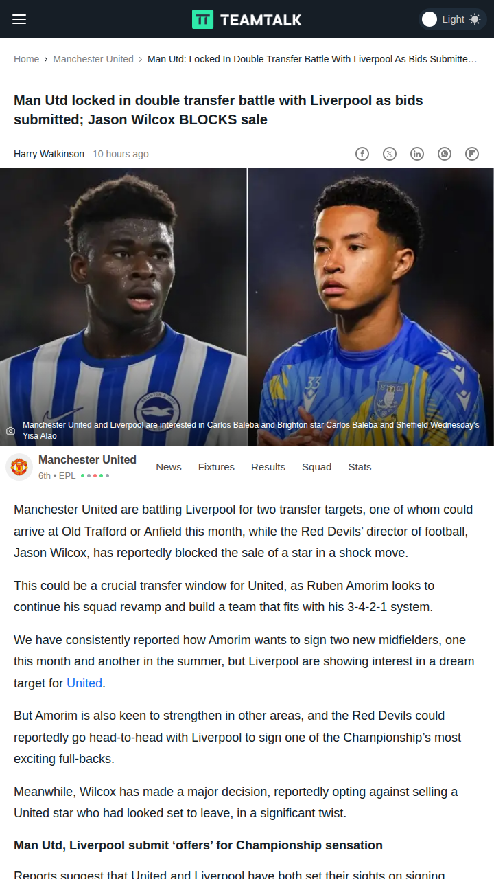 Tara Moran+FollowRed Devils & Reds Clash Over Rising StarThe transfer window is heating up as the Red Devils and the Reds go head-to-head for Sheffield Wednesday’s teenage sensation, Yisa Alao. Both clubs have reportedly tabled identical bids for the 17-year-old left-back, making this a classic North-West rivalry in the market. Meanwhile, Jason Wilcox has thrown a curveball by blocking Manuel Ugarte’s exit, signaling United’s intent to hold onto key assets. This could be a pivotal month for Amorim’s rebuild at Old Trafford. #Sports #Soccer #MUFC00Share