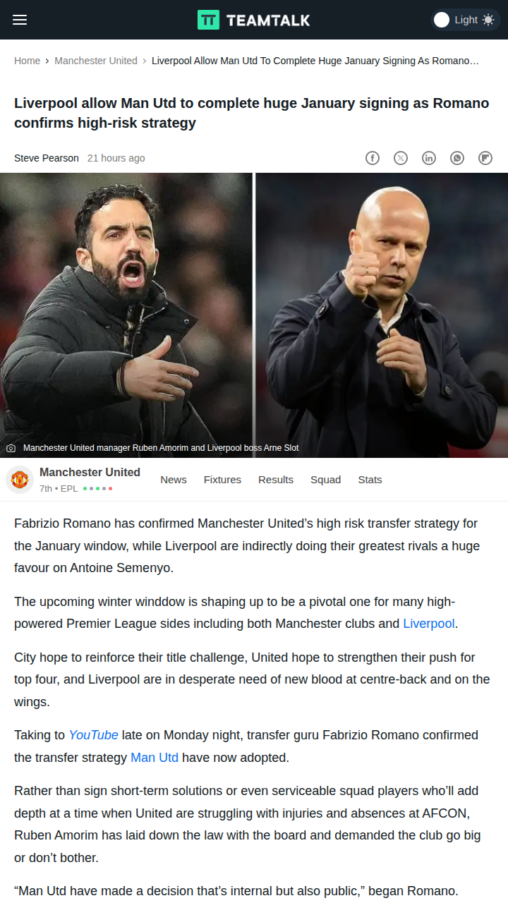 Timothy Thompson+FollowLiverpool’s Big Assist: Semenyo to United?Looks like the Red Devils are all-in this January! Transfer guru Fabrizio Romano just confirmed United’s high-risk, long-term strategy—no more short-term fixes. The real twist? Liverpool, despite their own injury woes, are stepping aside on Antoine Semenyo, giving United a clear shot at the Bournemouth winger. But don’t count out City just yet—this transfer saga could go down to the wire! What do you think, Reds and Red Devils fans? #Sports #Soccer #MUFC00Share