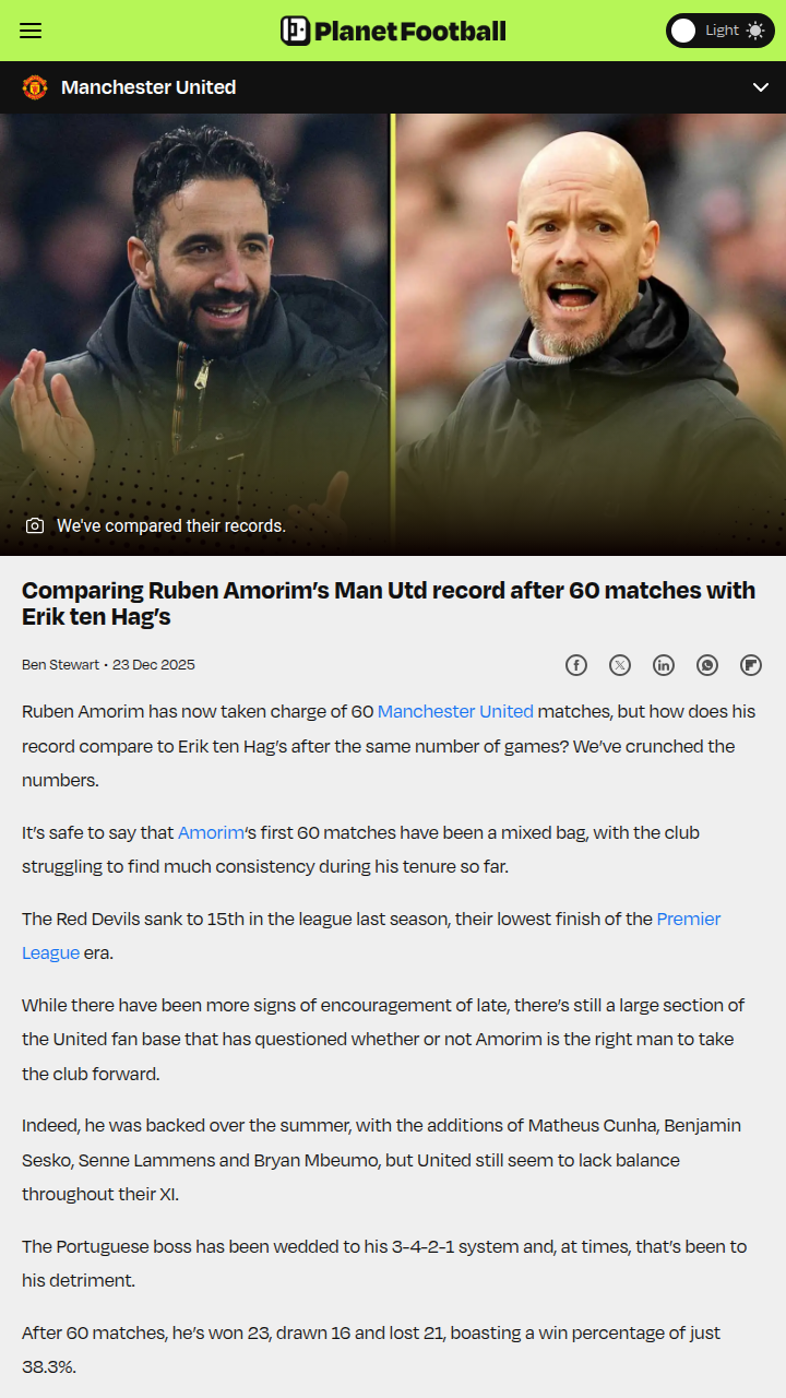 Maurice Miller+FollowAmorim vs Ten Hag: Red Devils' Rocky StartRed Devils fans, how are we feeling about Amorim after 60 games? His record (23W, 16D, 21L) doesn’t stack up to Ten Hag’s hot start (41W, 8D, 11L), and the 3-4-2-1 system still divides opinion. Even with summer signings, United’s balance is off. Are we seeing enough progress, or is Sir Jim Ratcliffe already questioning the call? Let’s hear your takes on this Old Trafford saga! #Sports #Soccer #MUFC00Share