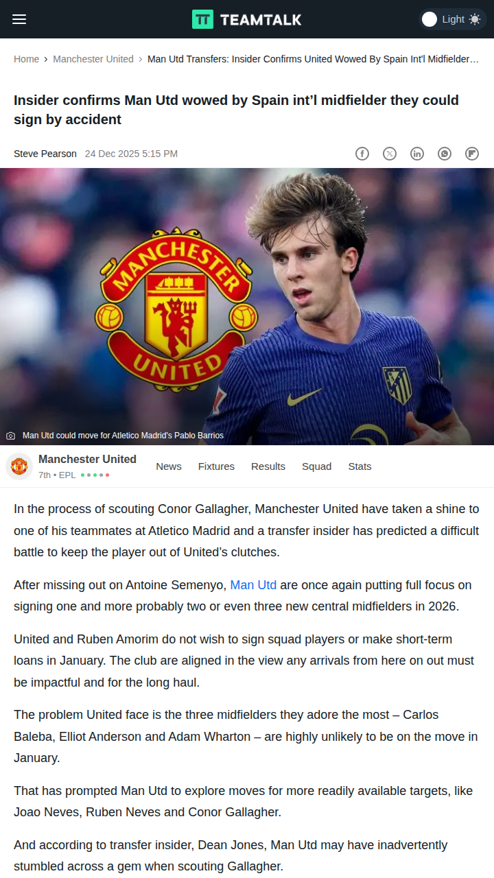 Allison Travis+FollowRed Devils Eye Atleti’s Barrios After Gallagher ScoutLooks like the Red Devils’ hunt for midfield magic just took a twist! While checking out Conor Gallagher, United scouts have been wowed by Atleti’s young maestro Pablo Barrios. The Spanish international, only 22, is seen as a long-term fit—way more than just a squad player. Atleti won’t let him go easy, but could we see a transfer tug-of-war brewing for Barrios in 2026? #Sports #Soccer #MUFC00Share