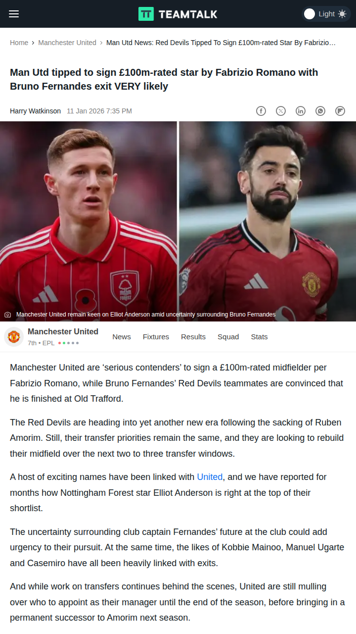 kochcandice+FollowBruno Exit Looms as Man Utd Eyes £100m AndersonBig news from Old Trafford: King Bruno could be on his way out, with teammates reportedly convinced his time as Red Devils captain is done. Transfer guru Fabrizio Romano says United are now serious contenders for Forest’s £100m-rated Elliot Anderson. With midfield legends like Casemiro and Mainoo also linked to exits, United’s rebuild is heating up. Could Anderson be the next big name in red? Let’s hear your thoughts on this potential changing of the guard! #Sports #Soccer #MUFC00Share
