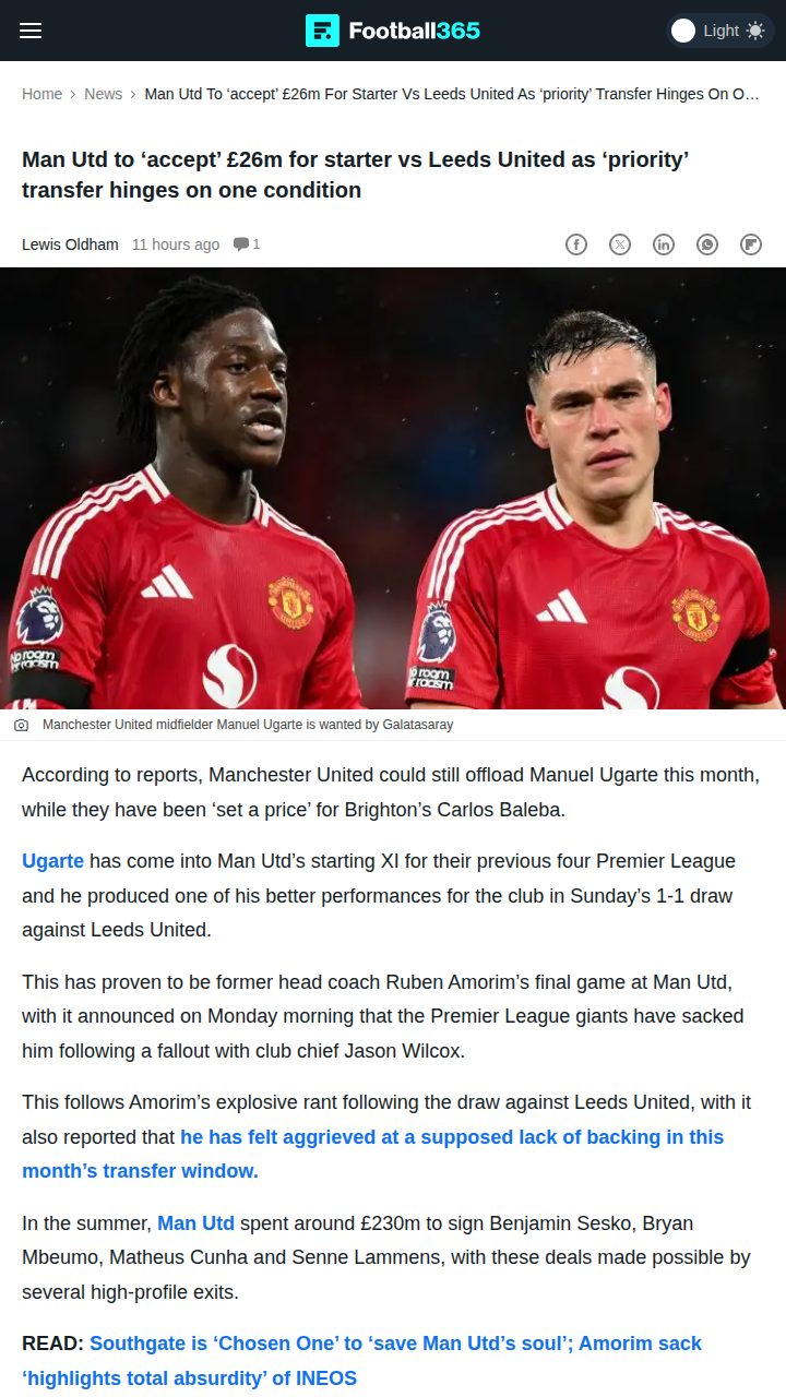 rogerschristine+FollowMan Utd’s Ugarte Saga: Leeds Draw FalloutRed Devils fans, what a wild week! After a gritty 1-1 with Leeds, Manuel Ugarte put in a shift, but the real drama was off the pitch. Amorim’s explosive rant post-match cost him his job, and now Ugarte could be on his way out—if Galatasaray meets United’s £26m demand. The midfield rebuild is on, but will the club land Brighton’s Baleba or stick with the current core? Thoughts on the shakeup? #Sports #Soccer #MUFC00Share