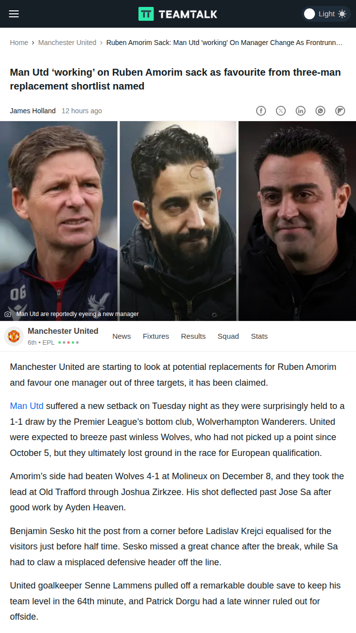 Jillian Morse+FollowMan United vs Wolves: Shock Draw FalloutRed Devils fans, what a wild ride at Old Trafford! After Amorim’s United took the lead, Wolves—the league’s bottom side—clawed back for a 1-1 draw, sparking major frustration and boos at full time. Now, word is the board’s quietly lining up Oliver Glasner as a top replacement if things don’t turn around. Do you think Amorim deserves more time, or is it time for a new era? Let’s hear your takes! #Sports #Soccer #ManUnited00Share