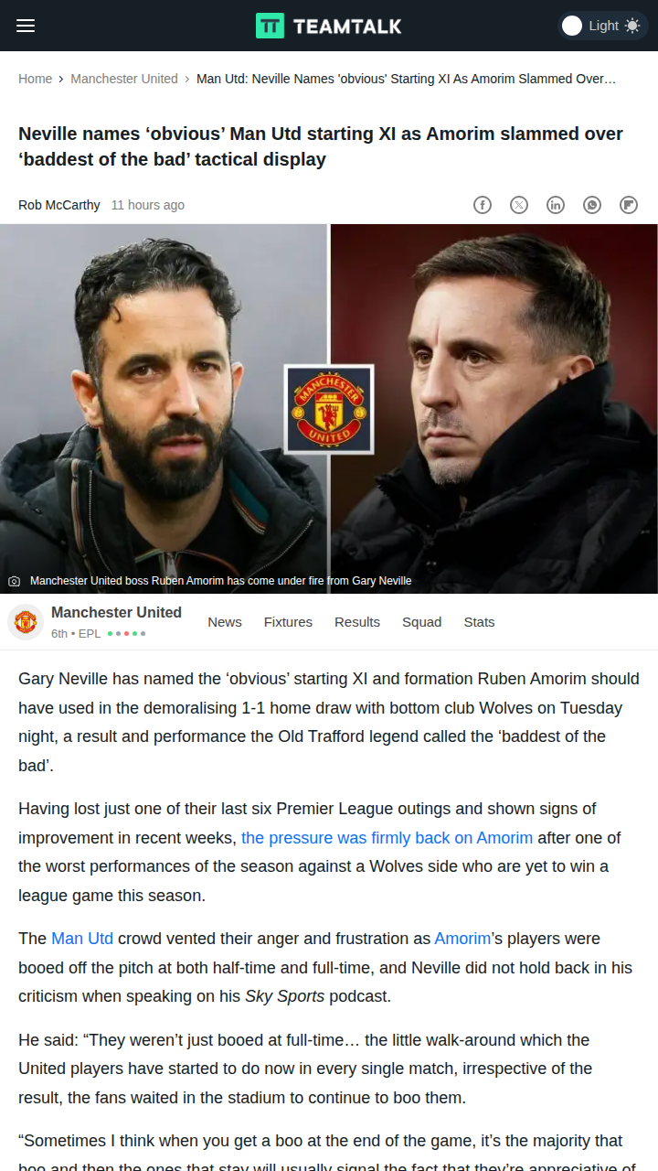 Maurice Miller+FollowMan United vs Wolves: Neville Slams AmorimRed Devils fans, what did you make of that 1-1 against Wolves? King Gary Neville didn’t hold back, calling Amorim’s tactics the ‘baddest of the bad’ and saying the ‘obvious’ XI was staring him in the face. The crowd’s double booing said it all. With AFCON and injuries, Neville’s lineup made sense—so why complicate it? Is Amorim overthinking or are the players letting him down? Let’s hear your takes before the Leeds clash! #Sports #Soccer #ManUnited00Share