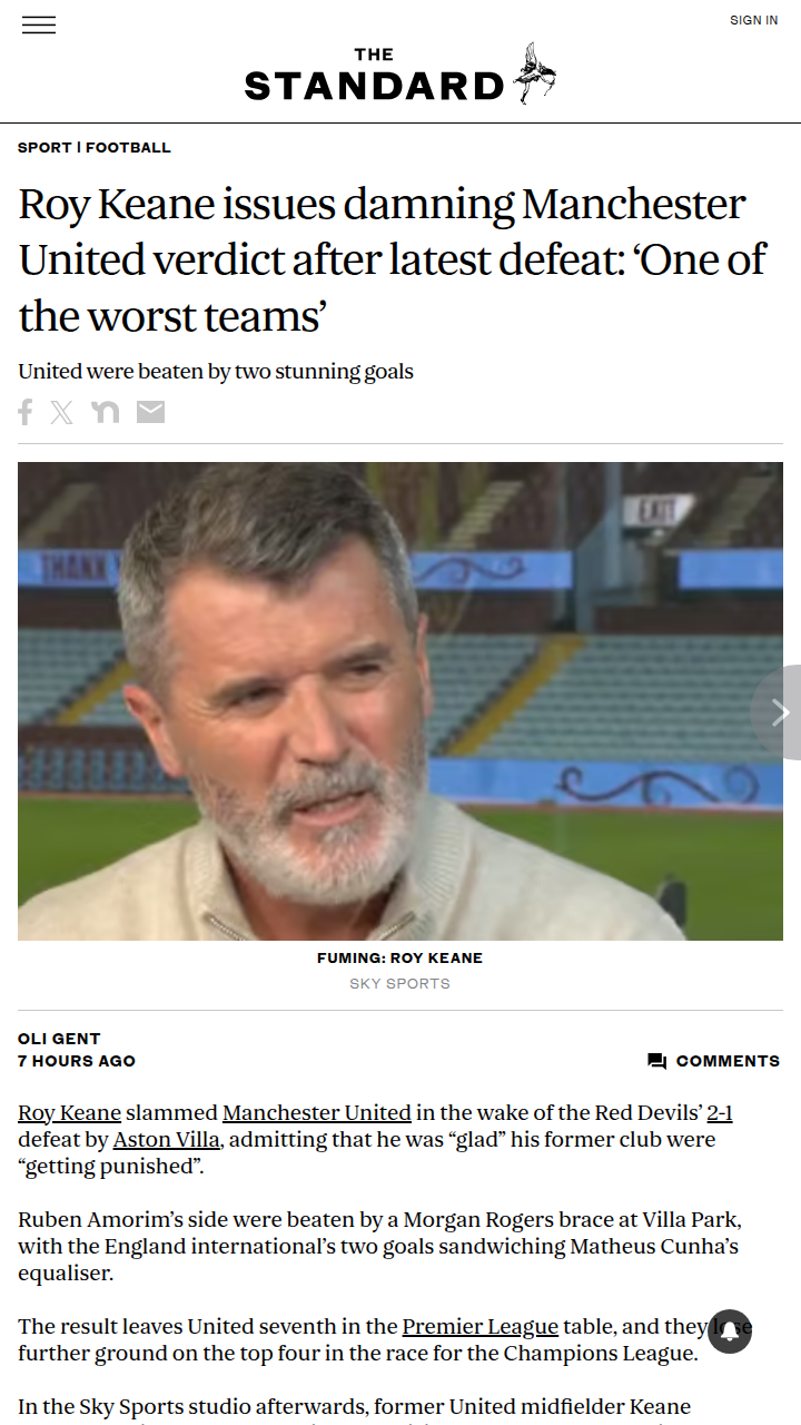 Malik Williams+FollowKeane Rips Into Red Devils After Villa LossWow, Roy Keane didn’t hold back after United’s 2-1 defeat to Villa. The Red Devils legend called this squad “one of the worst teams” out of possession and said he’s glad they’re being punished for cutting corners. Morgan Rogers’ brace sealed it for Villa, leaving United stuck in 7th and falling further from the Champions League spots. Is Keane right, or is this just classic tough love from Captain Fantastic? #Sports #Soccer #ManUnited00Share