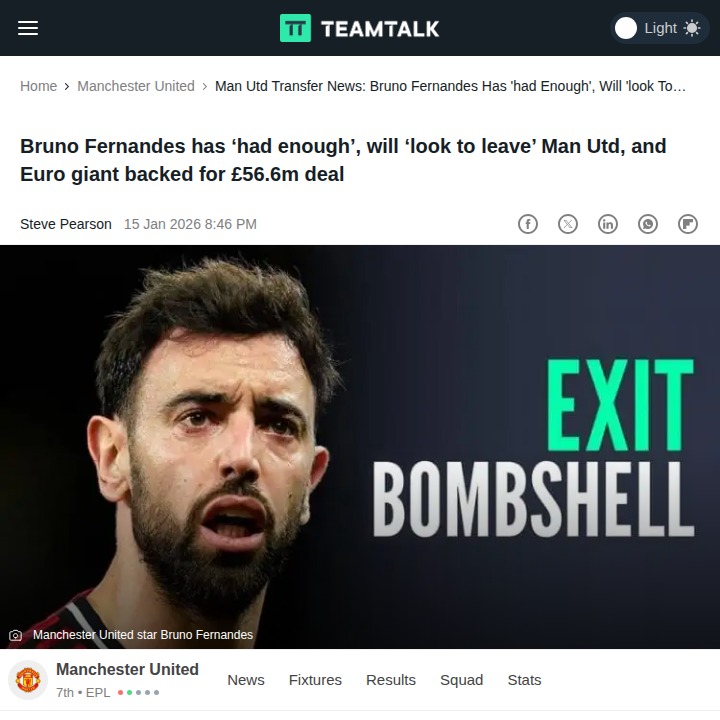 rogerschristine+FollowBruno Ready to Leave Old Trafford?Looks like the Portuguese Magnifico has finally had enough of the chaos at Old Trafford. Reports are heating up that Bruno could be eyeing a move to Bayern Munich, with the German giants tipped to trigger his £56.6m release clause. After years of carrying United, can you blame him for wanting to chase trophies elsewhere? This could be the biggest captain exit since Rooney! Thoughts on who should wear the armband next if Bruno bounces? #Sports #Soccer #ManUtd00Share