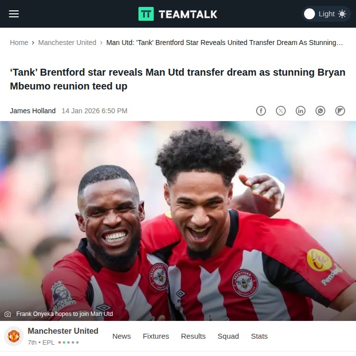 Tara Moran+FollowFrank the Tank Eyes Man United MoveBig news for Red Devils fans: Frank “the Tank” Onyeka has openly admitted he’d love to join Manchester United, hinting at a potential reunion with Bryan Mbeumo at Old Trafford. After United’s record-breaking swoop for Mbeumo, could Onyeka be the next Brentford star to make the jump? His standout AFCON performances have only fueled the transfer buzz. Would you welcome Frank’s energy in our midfield? #Sports #Soccer #ManUtd00Share