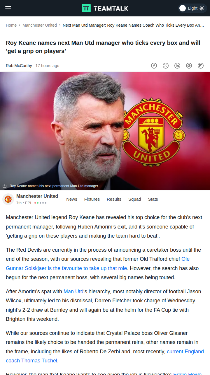Timothy Thompson+FollowRoy Keane Backs Eddie Howe for Red Devils JobRoy Keane has thrown his support behind Eddie Howe as the next permanent boss for the Red Devils, saying Howe 'ticks every box' and can finally get a grip on the squad. With Ruben Amorim out after a spat with the board and Fletcher stepping in as caretaker, the debate is heating up. Would Howe’s calm but tough approach be the answer to United’s ongoing struggles? #Sports #Soccer #ManUtd00Share