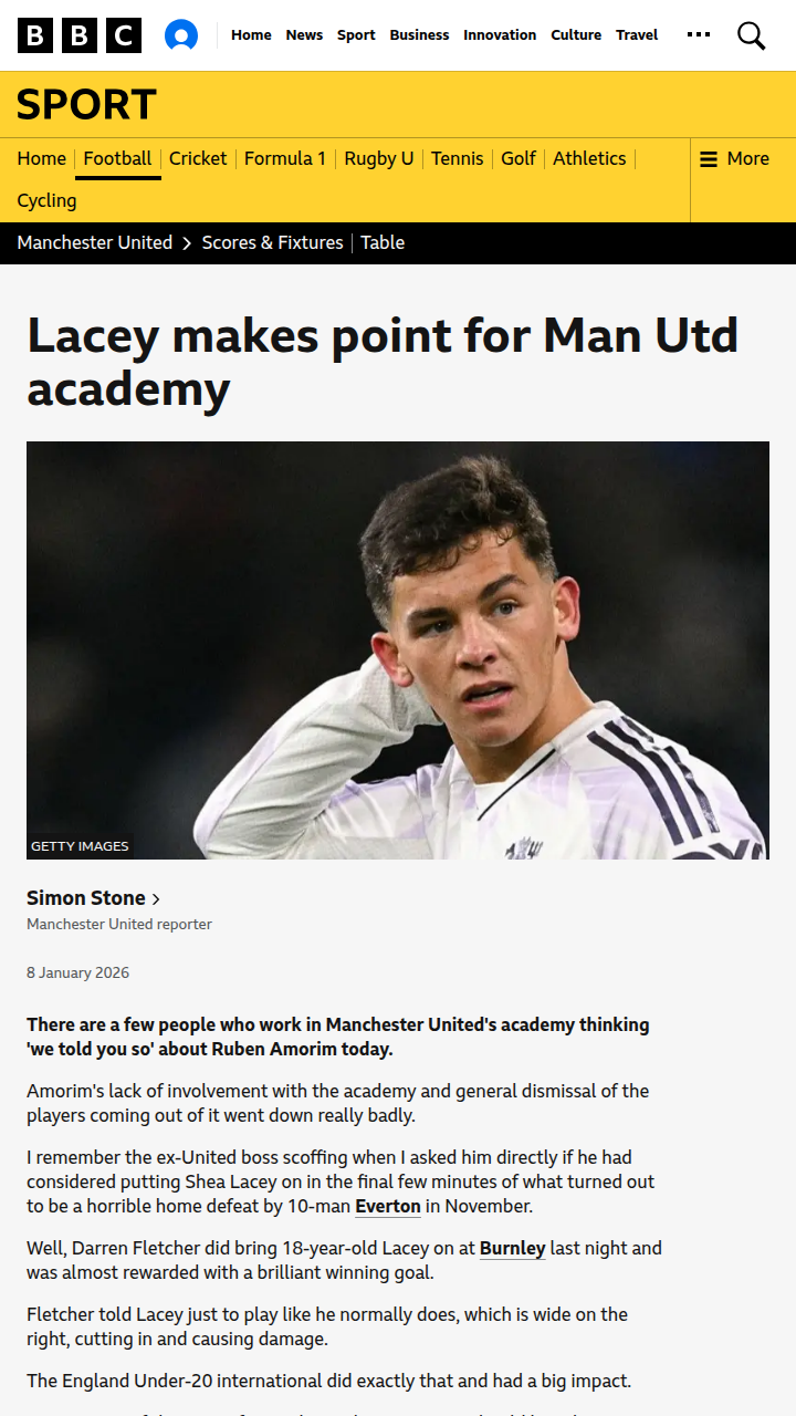 Timothy Thompson+FollowShea Lacey shines for Man Utd at BurnleyShea Lacey’s debut for Manchester United against Burnley is turning heads—especially among those who’ve championed the club’s academy talent all along. After being overlooked by former boss Ruben Amorim, Lacey finally got his shot thanks to Darren Fletcher, and nearly scored a match-winner. The 18-year-old England youth international played with confidence, sticking to his strengths out wide and making an immediate impact. It’s a big moment for United’s academy, showing just how much untapped potential is waiting for a chance. What do you think—should United trust their young stars more often? #Sports #Soccer #ManUtd00Share