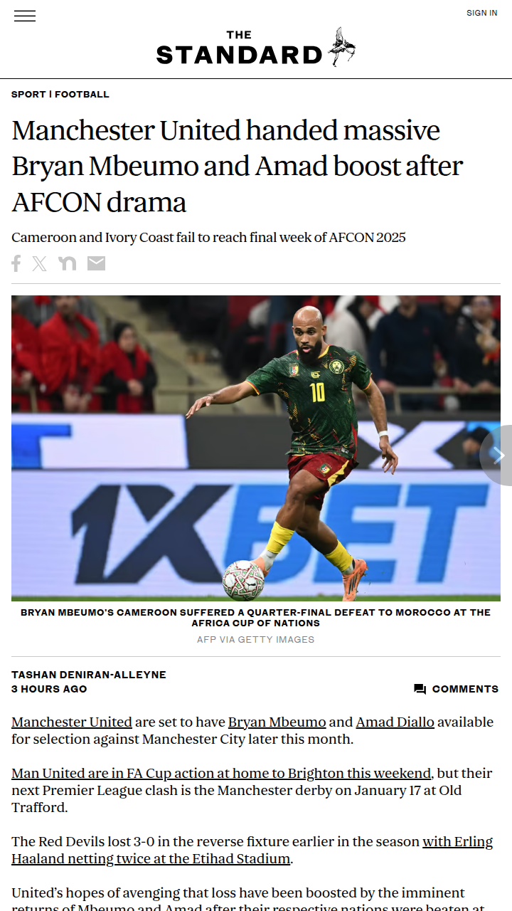 Malik Williams+FollowRed Devils Get Mbeumo & Amad Back for DerbyBig news for the Red Army! After some AFCON heartbreak, both Bryan Mbeumo and Amad Diallo are set to return to Manchester United just in time for the Manchester derby. With the Red Devils looking to avenge that 3-0 loss to City (remember Haaland’s double?), having these two back could be a game-changer. Thoughts on how this boosts our chances at Old Trafford? #Sports #Soccer #ManUtd00Share