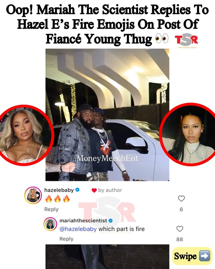 Gina Reynolds+FollowMariah Claps Back at Hazel E’s Emojis 🔥Mariah The Scientist just put Hazel E on blast for dropping fire emojis under a Young Thug video! Mariah jumped in the comments asking what exactly Hazel thought was ‘fire,’ sparking a whole debate. Fans are split—some say Mariah’s just protecting her man, others think she’s doing too much. Hazel E insists it’s not that deep, but this little emoji drama has the fandom buzzing! #Entertainment #Celebrity #MariahTheScientist00Share