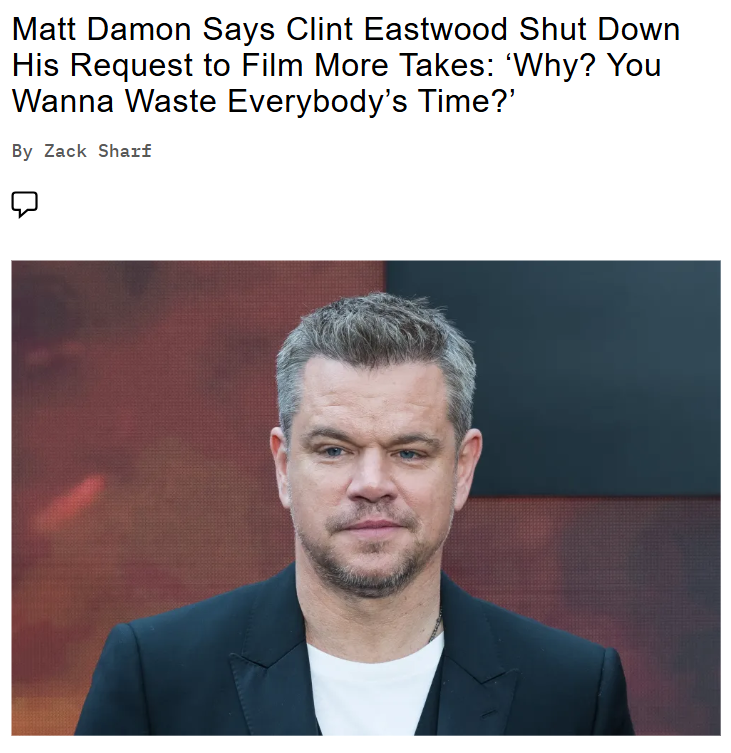 esaunders+FollowMatt Damon vs. Clint Eastwood On Set 🎬Matt Damon just spilled major tea about working with Clint Eastwood! Apparently, on his first day filming “Invictus,” Damon asked for another take, but Eastwood totally shut him down with, “Why? You wanna waste everybody’s time?” Fans are split—some say Eastwood’s efficiency is legendary, others think Damon deserved more shots. Is Eastwood too tough, or just a pro? #Entertainment #Movies #MattDamon21Share