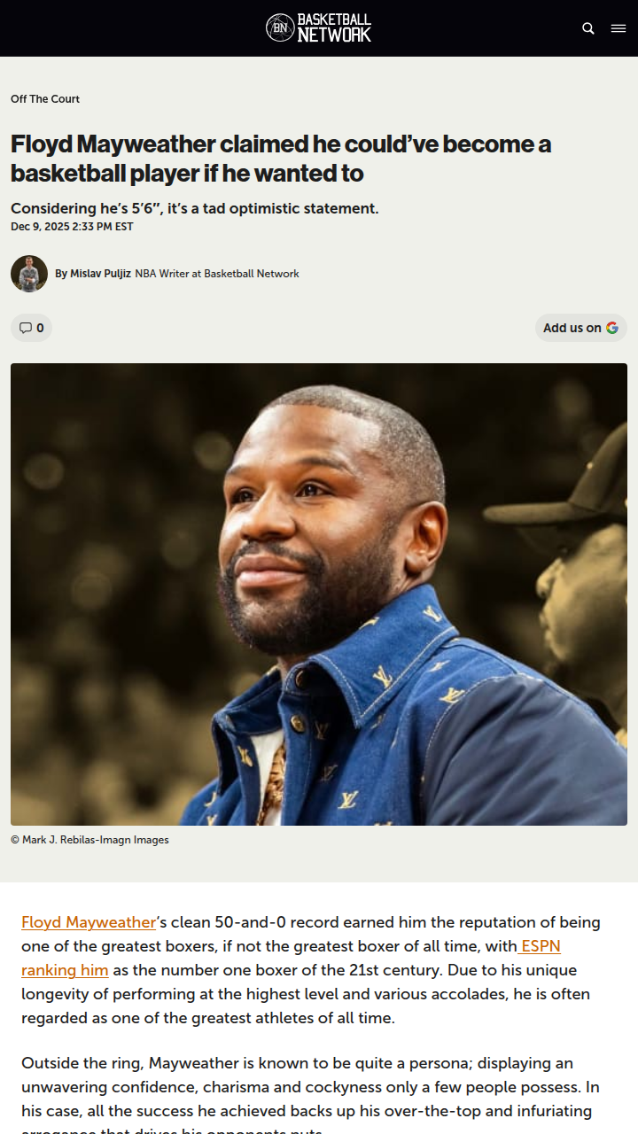 Diamond Horton+FollowCould Money Mayweather Really Ball in the NBA?Money Mayweather just claimed he could’ve been an NBA star if he wanted—do you buy it? Sure, he’s 50-0 in the ring and a Miami Heat superfan, but even his legendary footwork couldn’t save him from getting crossed up by streetball icon Bone Collector at a charity game. Is this just classic Floyd confidence, or could he have actually made it in the league? Let’s hear your takes! #Sports #Wrestling #Mayweather00Share