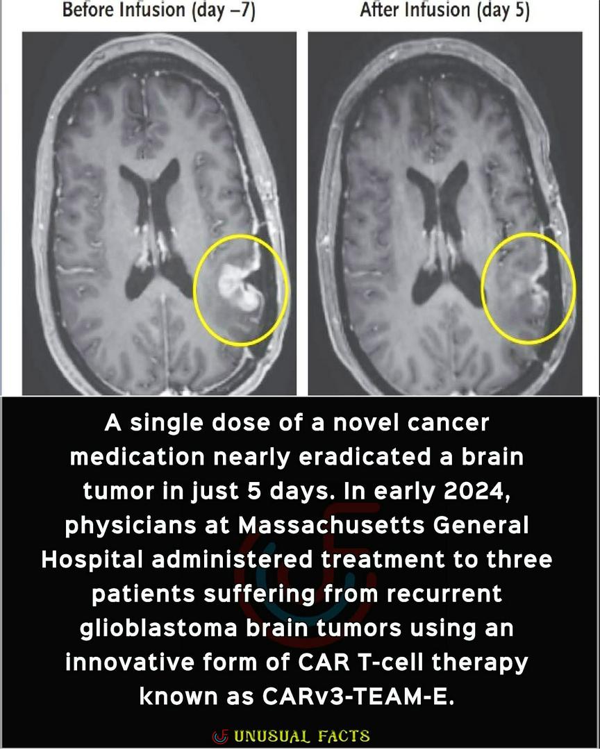 The astonishing result where a single dose of a new CAR T-cell therapy caused a patient's recurrent brain tumor to nearly disappear in just five days is True, originating from a groundbreaking early 2024 trial at Massachusetts General Hospital (MGH). 🤩