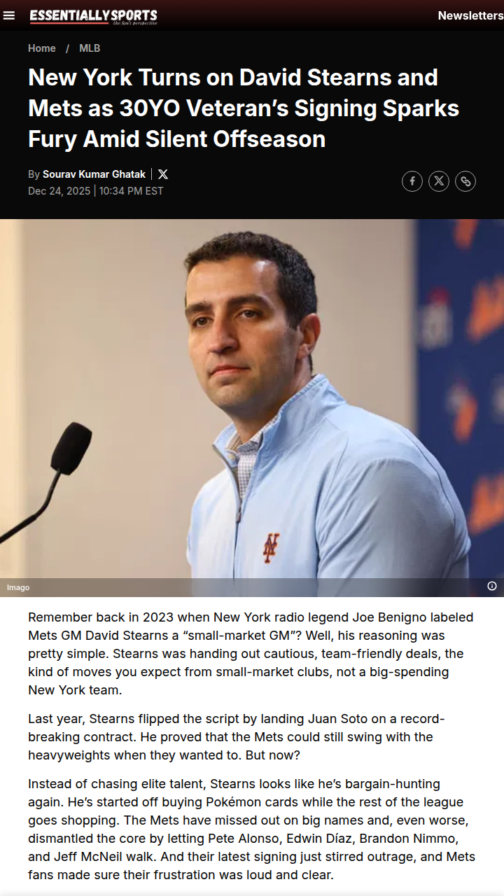 Maria Chavez+FollowMets fans fume over latest bullpen moveNew York Mets fans are fired up after GM David Stearns signed 30-year-old Mike Baumann to a minor-league deal, especially with big names still on the market and core players like Pete Alonso and Edwin Díaz gone. Baumann’s recent stats—struggles in Japan and a rocky 2024 in MLB—aren’t inspiring much hope. Many are questioning if this “small-market” approach fits a team with big-city expectations. With the offseason so quiet, the community is buzzing: Is this the new Mets way, or is something bigger coming? What do you think about the team’s direction? #Sports #Baseball #Mets00Share
