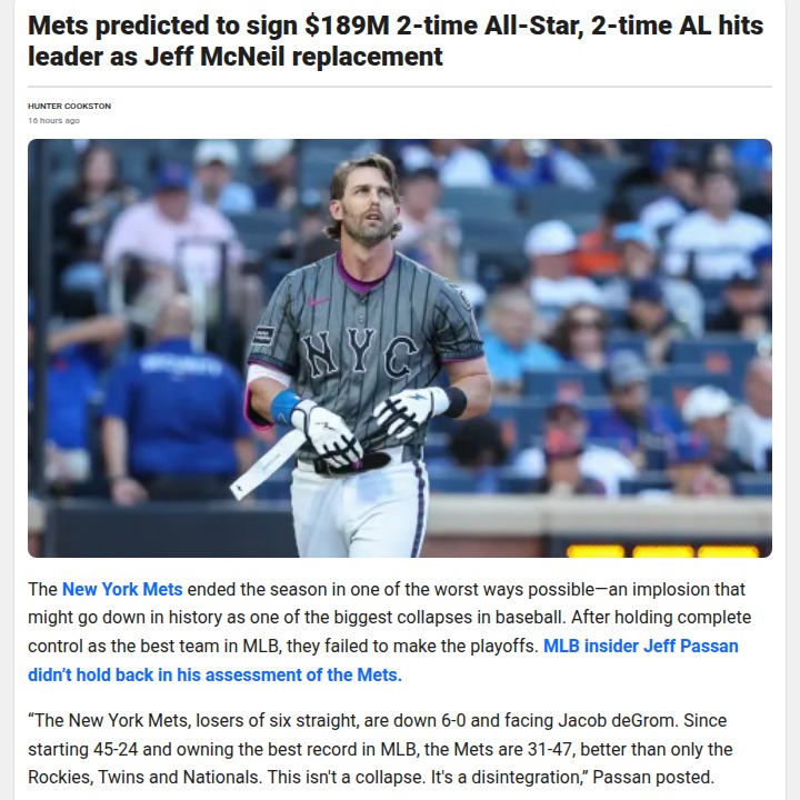 Timothy Huff MD+FollowMets Eye Bo Bichette After McNeil TradeTough times in Queens, folks. After the Mets shipped the Squirrel (Jeff McNeil) to Oakland, rumors are heating up that Bo Bichette could be the next big splash in Flushing. Bichette’s bat would be a game-changer, especially after last season’s epic collapse. The front office knows the pressure’s on to bounce back—could Bichette be the answer at second base? Let’s hear your takes, Mets fans! #Sports #Baseball #Mets00Share