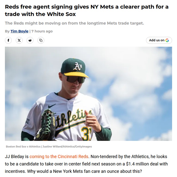 Andrea Castillo+FollowReds Move Clears Mets’ Path to Land Robert Jr.With JJ Bleday heading to the Reds, Cincy looks set in center field—meaning the Mets are now the frontrunners to snag Luis Robert Jr. from the White Sox. The Reds’ pivot to a cheaper option takes them out of the Robert sweepstakes, giving Steve Cohen’s crew a clearer shot at adding some serious pop to the lineup. Could this be the big move that finally fills the Mets’ outfield gap? #Sports #Baseball #Mets00Share