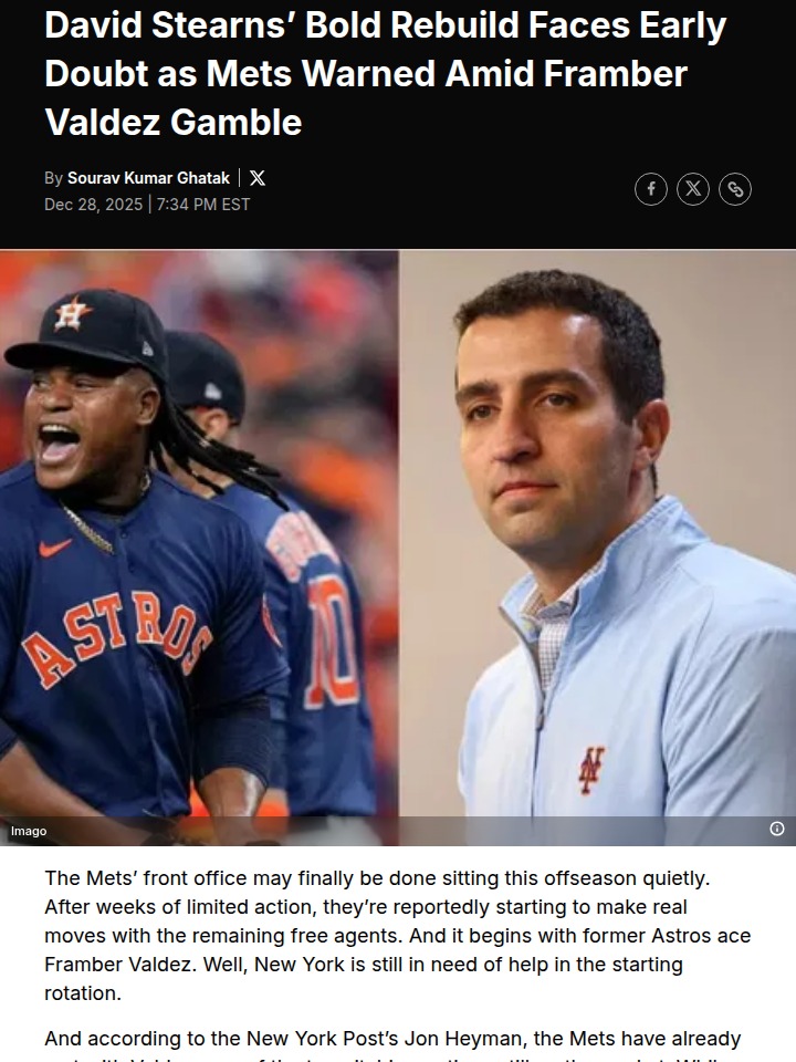 Tammy Sellers+FollowMets Eye Valdez After Blue Jays’ Big SpendLooks like Uncle Steve and Stearns might finally be ready to make a splash! With the Blue Jays dropping $210M on Cease, Toronto’s out of the Framber Valdez race—opening the door for the Amazins. Valdez’s durability and playoff chops could be just what the Mets need after losing Polar Bear Pete and Sugar Diaz. Is this the move that turns the offseason around for Queens? Let’s hear your takes! #Sports #Baseball #Mets00Share