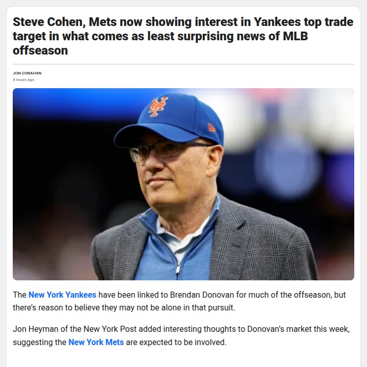 terrysharon+FollowMets Crash Yankees’ Donovan Party?Looks like Uncle Steve is at it again—reports say the Mets are now eyeing Brendan Donovan, the same versatile infielder the Bronx Bombers have been circling all offseason. If the Amazins outbid the Yankees for Donovan, it’ll add another spicy chapter to the Subway Series rivalry. Donovan’s glove and bat would fit either squad, but with both teams in the mix, expect the price to skyrocket. Who do you think needs him more? #Sports #Baseball #Mets00Share