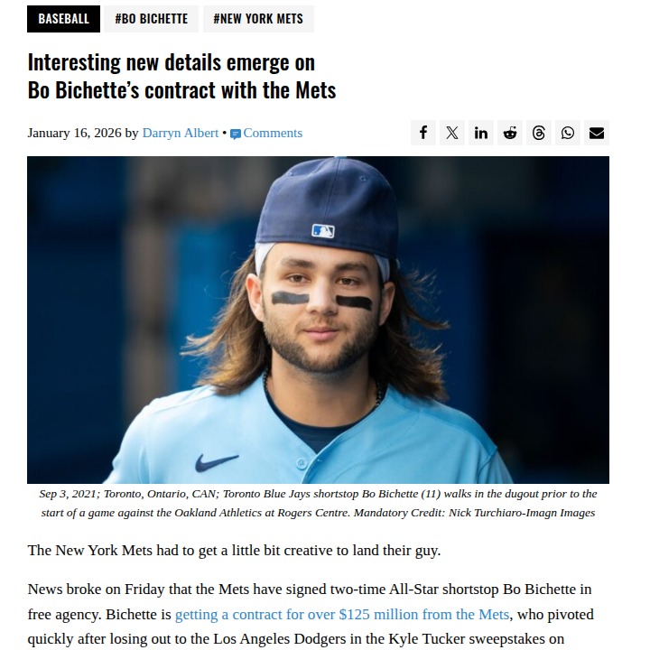Catherine Reeves+FollowBo Bichette’s Blockbuster Mets Deal: No-Trade DramaMets fans, what a wild ride! After missing out on Kyle Tucker, the Amazins swooped in and locked up Bo Bichette with a creative $125M+ contract—no deferred money, two opt-outs, and a full no-trade clause. The real kicker? The Blue Jays’ former hit machine could pocket $47M by 2026 if he opts out. Bichette at third, Lindor and Semien up the middle—suddenly, the Mets’ offseason looks a whole lot brighter. Thoughts on this power move? #Sports #Baseball #Mets00Share