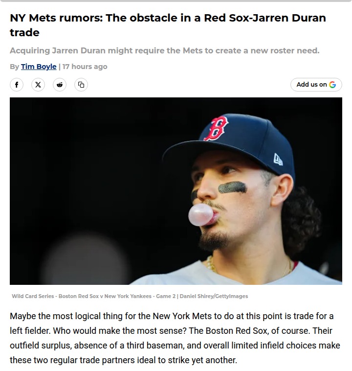 Cassandra Reed+FollowWhy the Mets won’t trade Brett BatyThe Mets are holding tight to Brett Baty, even as trade talks with the Red Sox heat up over outfielder Jarren Duran. While Boston’s crowded outfield and the Mets’ need for a left fielder seem like a perfect match, New York isn’t ready to give up their promising third baseman. Baty’s strong season has made him a key piece for the Mets’ future, and letting him go would just create more questions at third base. Would you risk Baty’s potential for a proven outfielder, or is it smarter to keep building from within? #Sports #Baseball #Mets00Share