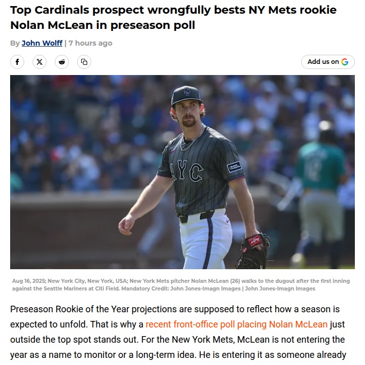 Timothy Huff MD+FollowDid Cards Prospect Really Outshine McLean?Anyone else think the preseason Rookie of the Year poll missed the mark? JJ Wetherholt’s hype is real, but Nolan McLean—aka the Mets’ new bullpen weapon—already proved he can handle big-league bats. Wetherholt’s numbers in the minors are strong, but until he faces MLB pitching, it’s all projection. McLean’s curveball is already fooling hitters, and his 2.06 ERA last year shows he’s for real. Shouldn’t proven performance count for more than potential? #Sports #Baseball #Mets00Share