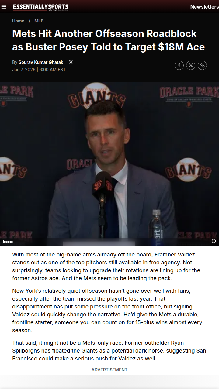 Cassandra Reed+FollowGiants vs Mets: Valdez Free Agency ShowdownLooks like the Mets’ quiet offseason just hit another snag, folks. With King Framber still on the market, both the Amazins and the Giants are eyeing the lefty ace to anchor their rotations. Buster Posey’s Giants could form a top-tier trio with Webb and Ray if they land Valdez, but Mets fans know he’s the missing piece in Queens. This could be the rivalry to watch—who lands the $18M ace and shifts the NL power balance? #Sports #Baseball #Mets00Share