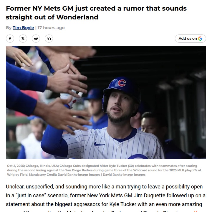 Catherine Reeves+FollowCould the Amazins Land Tucker & Belli?So, Jim Duquette just tossed Mets fans a real curveball—could Uncle Steve actually snag both Kyle Tucker and Cody Bellinger? The rumor mill is spinning, but let’s be real: a lefty-heavy outfield with those two and Juan Soto sounds more like fantasy baseball than reality. Even if King Cohen opens the vault, it’s a stretch. Let’s focus on landing one big bat and, please, some pitching! Thoughts? #Sports #Baseball #Mets32Share