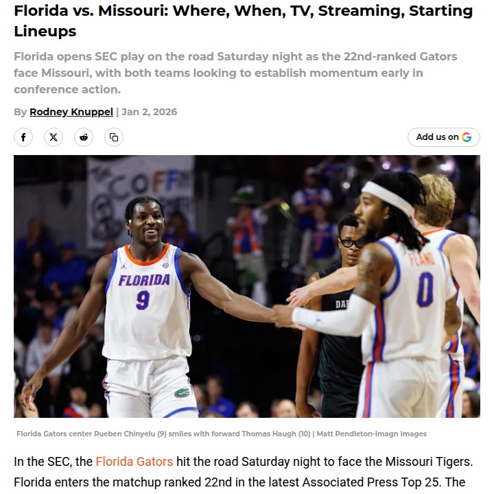 davidsonbrandon+FollowFlorida vs Missouri: SEC showdown heats upFlorida’s four-game win streak is on the line as they head to Columbia to take on a Missouri team desperate to bounce back after a tough loss. The Gators, ranked 22nd, have been finding their rhythm, but the real test is whether they can keep it rolling on the road. Missouri’s offense struggled last game, and with key players possibly returning from injury, this matchup could get interesting fast. Who do you think has the edge—Florida’s momentum or Missouri’s home-court hunger? Let’s hear your predictions and what you’re watching for! #Sports #FloridaGators #MissouriTigers00Share
