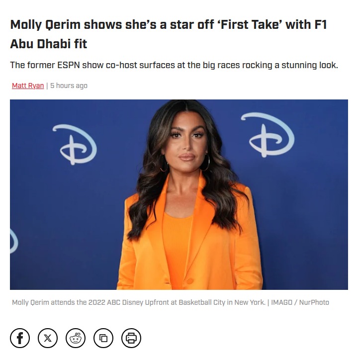 andersonkaren+FollowMolly Qerim Shines at F1 Abu DhabiMolly Qerim, the former First Take host, just made waves at the F1 Abu Dhabi Grand Prix, showing off her style and star power far from the ESPN desk. After her emotional and controversial exit—reportedly over a salary dispute—fans have been wondering what’s next for her. Qerim’s presence at the race proves she’s still a major player in the sports world, even as Shae Cornette takes her old seat. What do you think—will Molly return to TV, or is she onto bigger things? #Sports #MollyQerim #F110Share