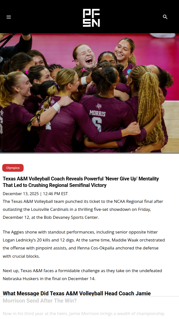 Jenna Gonzales+FollowTexas A&M Volleyball’s epic comeback fuels Elite Eight runTexas A&M Volleyball just pulled off one of their gutsiest wins ever, rallying past Louisville in a five-set thriller to reach the NCAA Regional final. Coach Jamie Morrison’s message after the match? This team refuses to fold, even when the pressure’s on. With Logan Lednicky smashing 20 kills and Ifenna Cos-Okpalla breaking block records, the Aggies are showing what true resilience looks like. Now, they’re set to face undefeated Nebraska. Can this never-give-up mentality carry them to their first NCAA title? What do you think makes a team truly unstoppable in crunch time? #Sports #AggieVolleyball #NCAATournament10Share