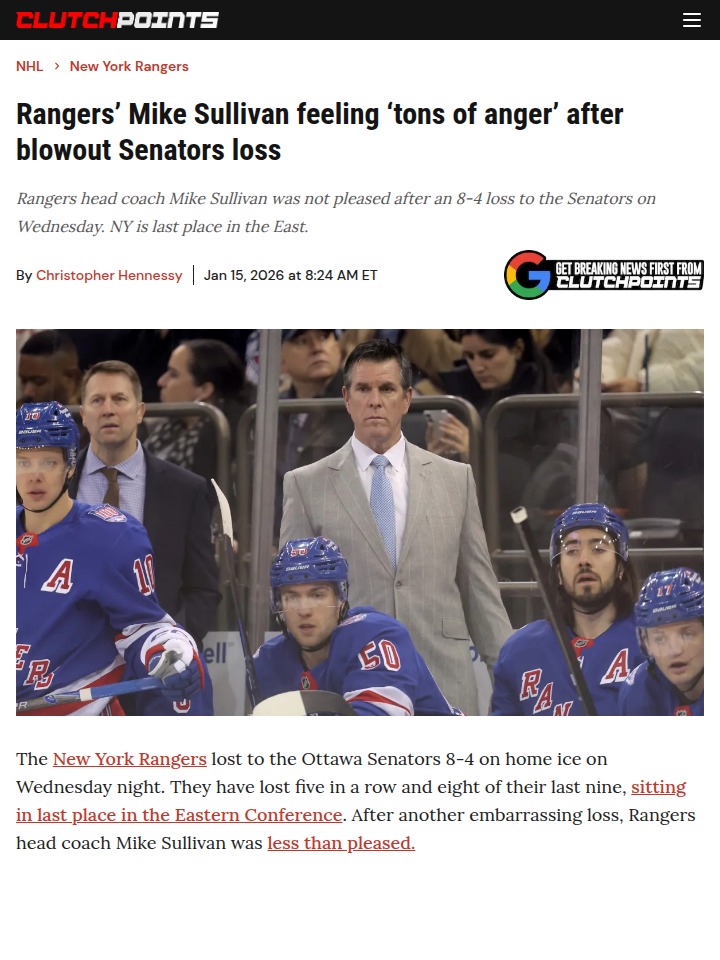 Sherri West+FollowBlueshirts’ Meltdown: Sullivan’s Fury Boils OverThe Rangers’ latest 8-4 home ice blowout by the Senators has fans reeling. Coach Mike Sullivan, brought in to steady the ship, is feeling “tons of anger” as the Blueshirts drop their fifth straight and sit dead last in the East. With rumors swirling about Breadman Panarin’s future and GM Drury’s hot seat, is this the end of an era for the Broadway Blues? Let’s talk about what’s next for the squad. #Sports #IceHockey #NYRangers00Share