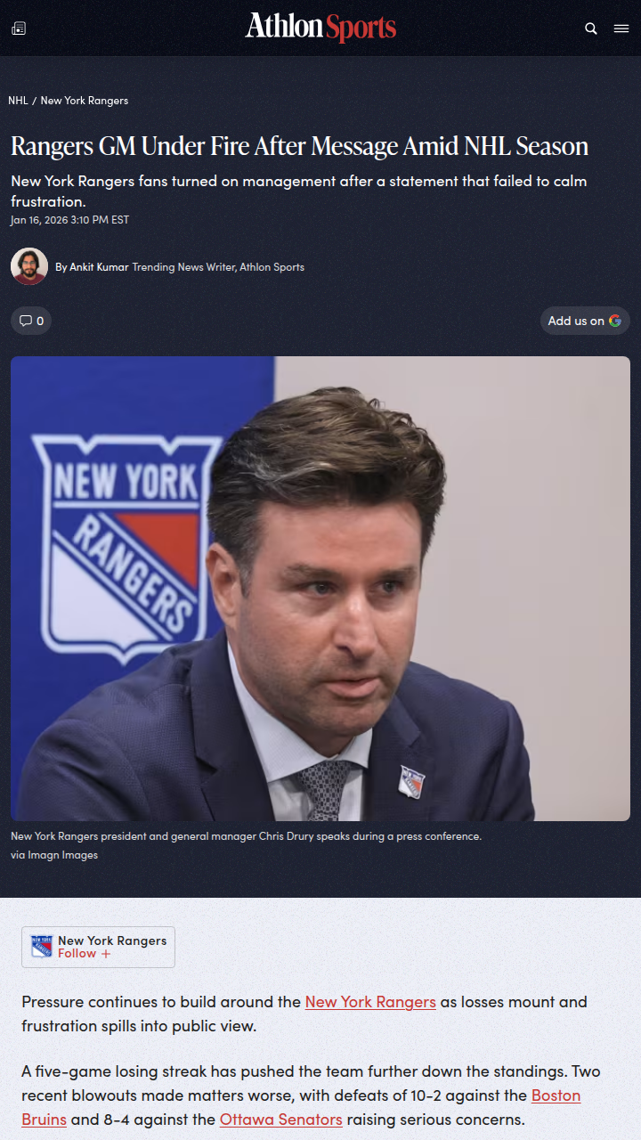 Sherri West+FollowRangers fans fed up after GM’s public messageLosing streaks are tough, but Rangers fans are hitting their breaking point after two brutal blowouts and a public message from GM Chris Drury. The team’s struggles—worst in the East, shaky defense, and key injuries—have left fans demanding real change, not just words. Drury insists this is a 'retool,' not a rebuild, but many aren’t buying it, flooding social media with calls for firings and lower ticket prices. Saturday’s game against the Flyers could be a turning point, but until the Rangers deliver wins, the heat on the front office isn’t going anywhere. How do you feel about the team’s direction? #Sports #IceHockey #NYRangers01Share