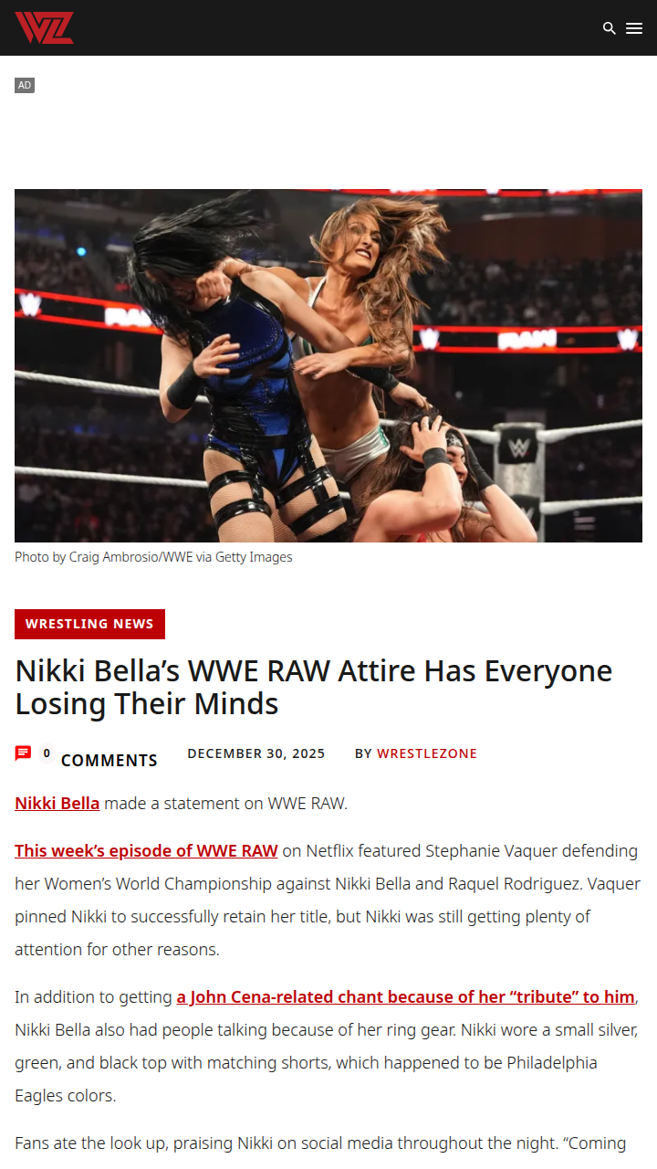 Stephanie Bailey+FollowNikki Bella rocks Eagles-inspired WWE RAW lookNikki Bella turned heads on WWE RAW, not just for her in-ring skills but for her bold tribute to the Philadelphia Eagles with her silver, green, and black gear. Fans couldn’t stop buzzing about her style, with social media lighting up over her look and her playful “Fly Eagles Fly” response. Even though she didn’t win the title, Nikki’s comeback and confidence stole the show. Whether you’re a wrestling fan, an Eagles supporter, or just love seeing someone own the spotlight, this moment had everyone talking. What do you think about athletes showing love for their favorite teams on the big stage? #Sports #Wrestling #NikkiBella50Share