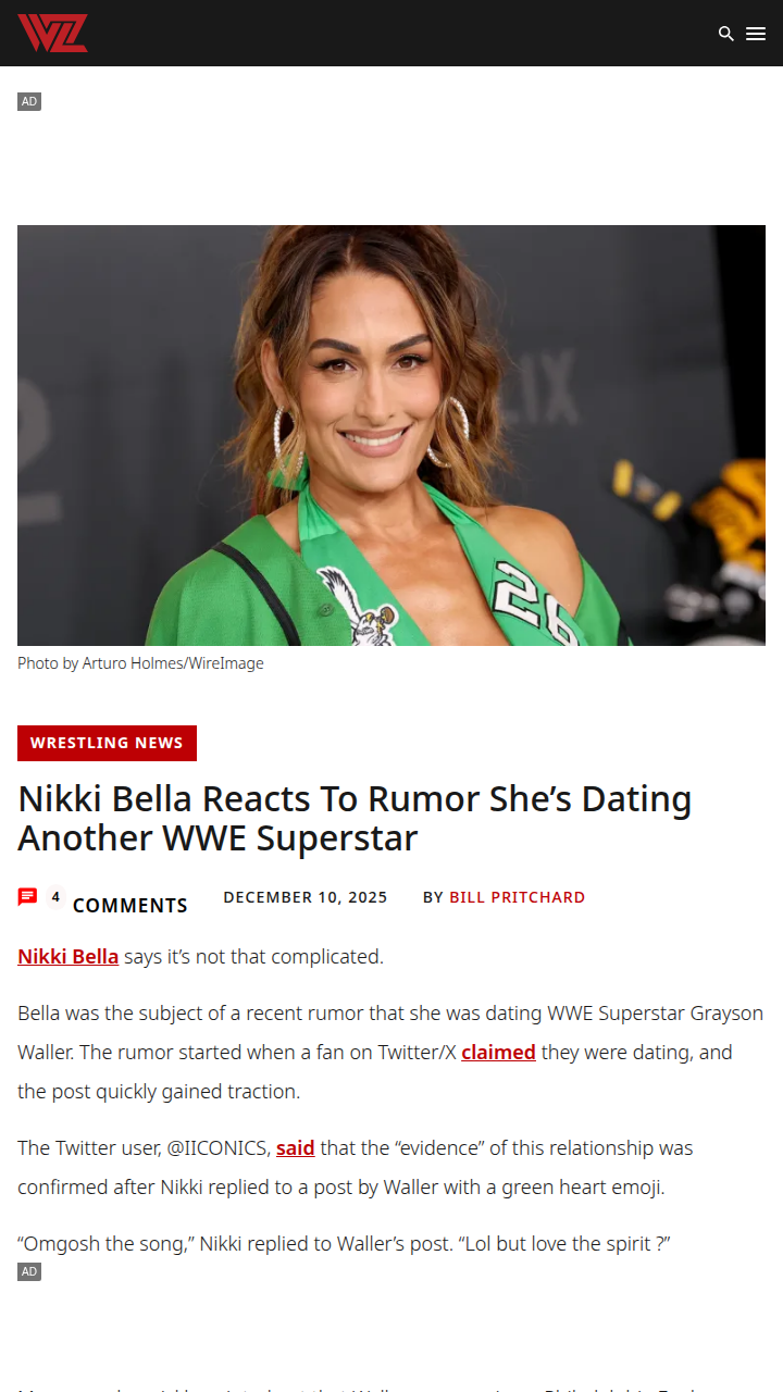 Betty Whitaker+FollowNikki Bella Shuts Down Eagles RumorLooks like Nikki Bella’s green heart emoji to Grayson Waller was just Birds pride, not a new WWE romance! The rumor mill went wild after Nikki replied to Waller’s Eagles sweatshirt post, but she set the record straight—she’s just repping Philly. Bella also addressed another wild claim about her and her fans, reminding everyone to check the facts before believing the gossip. Classic Nikki, always keeping it real! #Sports #Wrestling #NikkiBella30Share
