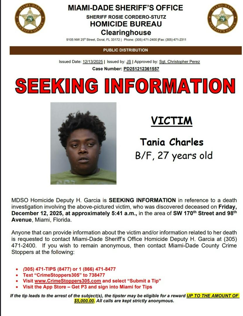 Alexander News Show+FollowFrom the Miami Dade County Sheriff Office. Please Read. MDSO Homicide Deputy H. Garcia is SEEKING INFORMATION in reference to a death investigation involving the above-pictured victim, who was discovered deceased on Friday, December 12, 2025, at approximately 5:41 a.m., in the area of SW 170th Street and 98th Avenue, Miami, Florida. Anyone that can provide information about the victim and/or information related to her death is requested to contact Miami-Dade Sheriff’s Office Homicide Deputy H. Garcia at (305) 471-2400. If you wish to remain anonymous, then contact Miami-Dade County Crime Stoppers at the following: • (305) 471-TIPS (8477) or 1 (866) 471-8477 • Text “CrimeStoppers305” to 738477 • Visit www.CrimeStoppers305.com and select “Submit a Tip” • Visit the App Store – Get P3 and sign into Miami for Tips. If the tip leads to the arrest of the subject(s), the tipster may be eligible for a reward UP TO THE AMOUNT OF $5,000.00. All calls are kept strictly anonymous. #Miamidade #NoticiasdeMiami #Crimestoppers #Alexandernewsshow.00Share