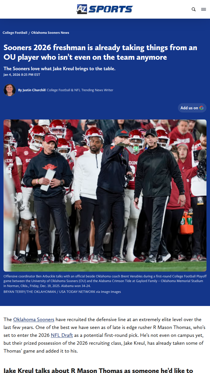 Jay Williams+FollowOU’s next star defender is already learning from the bestOklahoma’s 2026 edge rusher Jake Kreul is already shaping his game after R Mason Thomas—even though Thomas is headed for the NFL. Kreul, a standout from IMG Academy, says he’s picking up on Thomas’ technical skills and relentless style, thanks to the coaching at OU that values more than just size or speed. It’s wild to see a recruit this young already soaking up lessons from a future pro. If this is the new standard for Sooners’ defensive linemen, what does it mean for the team’s future in the SEC? Let’s talk about how this approach could change the game for OU. #Sports #Football #OklahomaSooners20Share