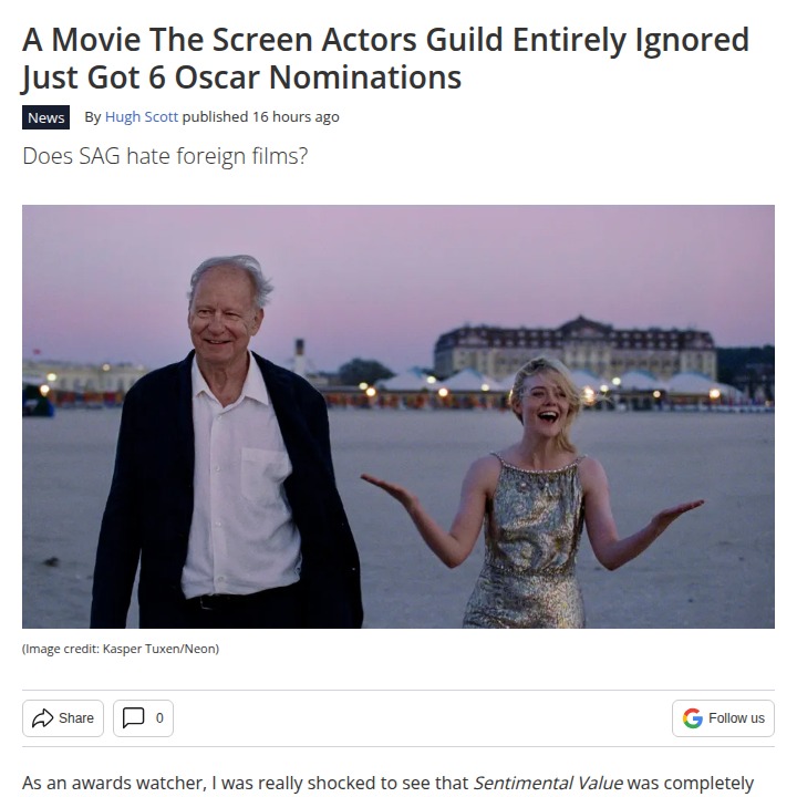 Kelsey Cook+FollowOscar Noms Snubbed by SAG?! 🎬Sentimental Value just pulled off a wild plot twist—totally ignored by the Screen Actors Guild, but now it’s up for SIX Oscars, including Best Picture and four acting categories! Fans are buzzing: is this another case of SAG overlooking foreign films, or did the Academy just prove everyone wrong? The debate is ON. Can’t wait to see who actually wins at the Oscars! #Entertainment #Movies #Oscars202600Share