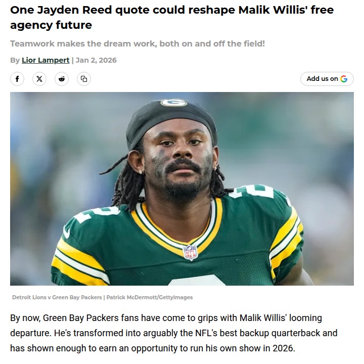 Aaron Taylor+FollowJayden Reed’s Praise: Malik Willis to Leave?Packers Nation, did you catch Jayden Reed’s latest comments about Malik Willis? The rookie wideout said there’s “no drop off” when Willis steps in for Jordan Love. With both Tom Brady and Phil Simms giving props to Willis, the buzz is real: could he be the better option? Reed’s praise might just drive up Willis’ free agency price, making his Green Bay exit all but certain. What do you think—should the Pack pay up or let him walk? #Sports #Football #Packers00Share