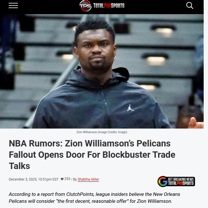 Susan Reeves+FollowZion Era Ending? Pelicans-Lakers Trade BuzzPels fans, is this the end of the Zion era? With the team off to a rough 3–18 start and King Zion sidelined again, rumors are swirling that New Orleans could move him—maybe even in a blockbuster with the Lakers. League insiders say the Pels might take the first decent offer, possibly including Herb Jones or Jose Alvarado. Is it time to rebuild, or does Zion deserve one more shot? #Sports #Basketball #Pelicans106Share